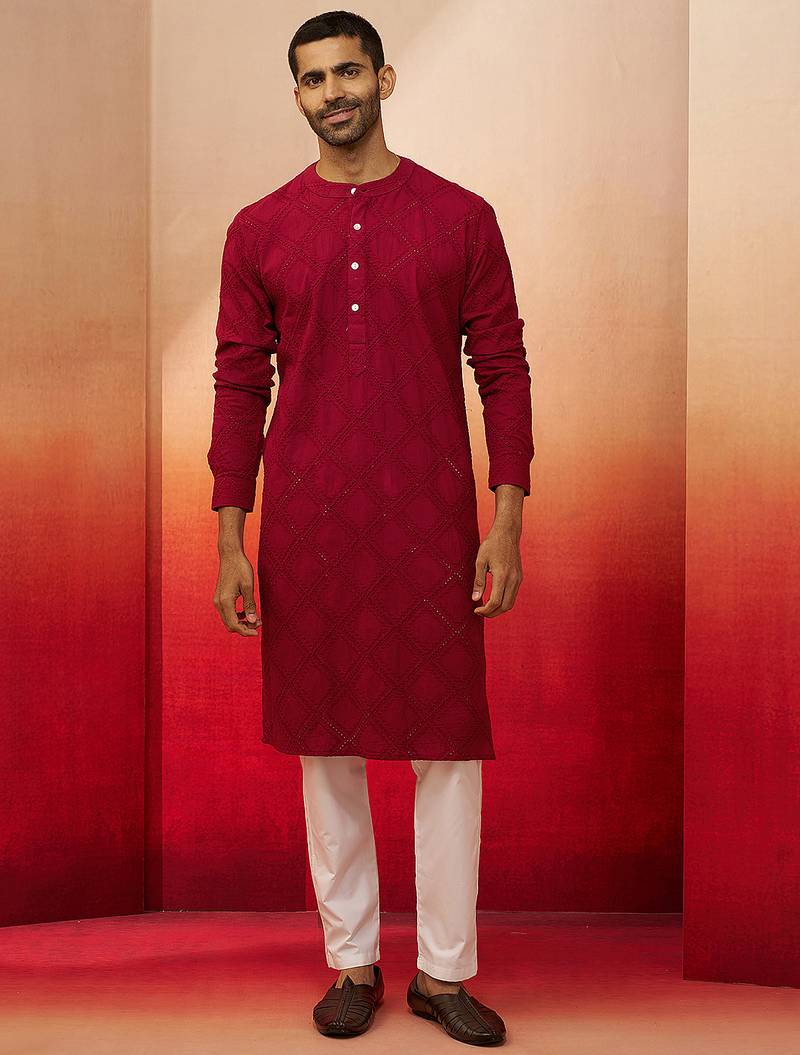 | Product Name | Red Thread Embroidered Kurta With Pyjama Band Collar Traditional Set | |