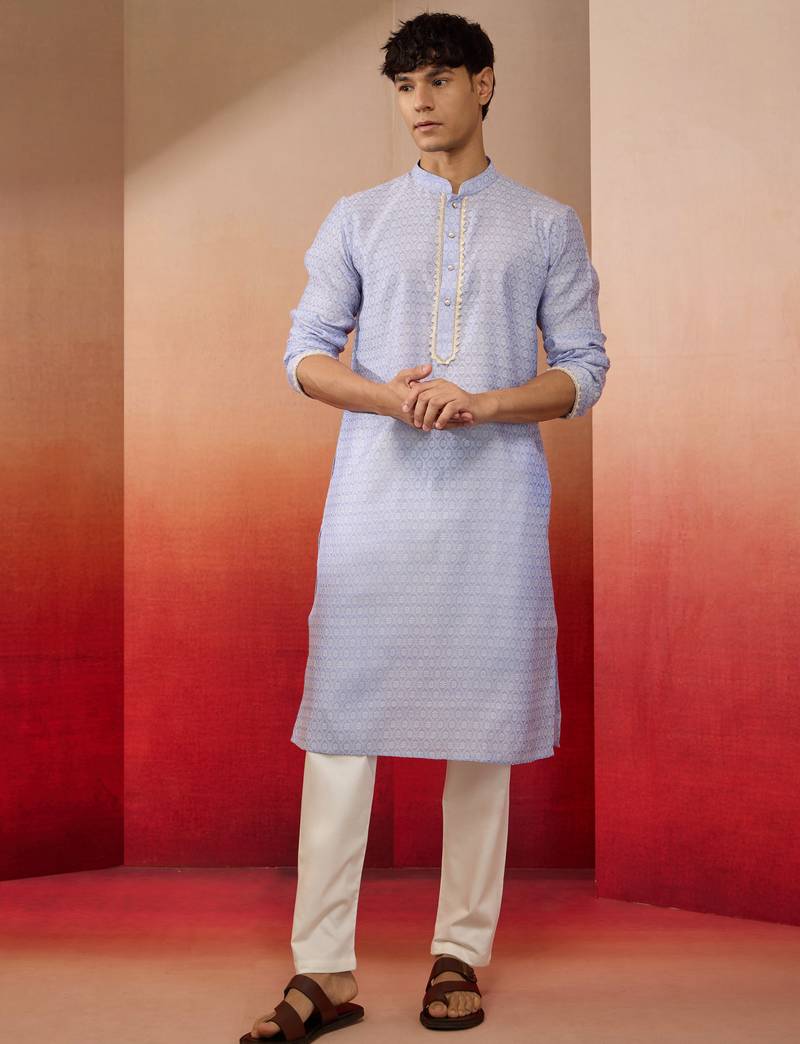 | Product Description | Experience Elegance With Vastramay's Serene Sky Blue Jacquard Kurta Set. Premium Silk Blend Fabric With Delicate Floral Jacquard Patterns, Mandarin Collar With Lace Accents, And Matching Pyjama For Traditional Celebrations. | |