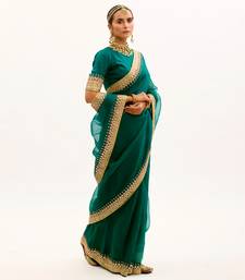 | Product Description | Featuring An Emerald Green Saree In Silk Organza Base With Hand Embroidered Gota And Marodi Border. It Is Paired With Matching Modal Satin Petticoat And Silk Stitched Blouse Having Having Makes And Gota Embroidery. |