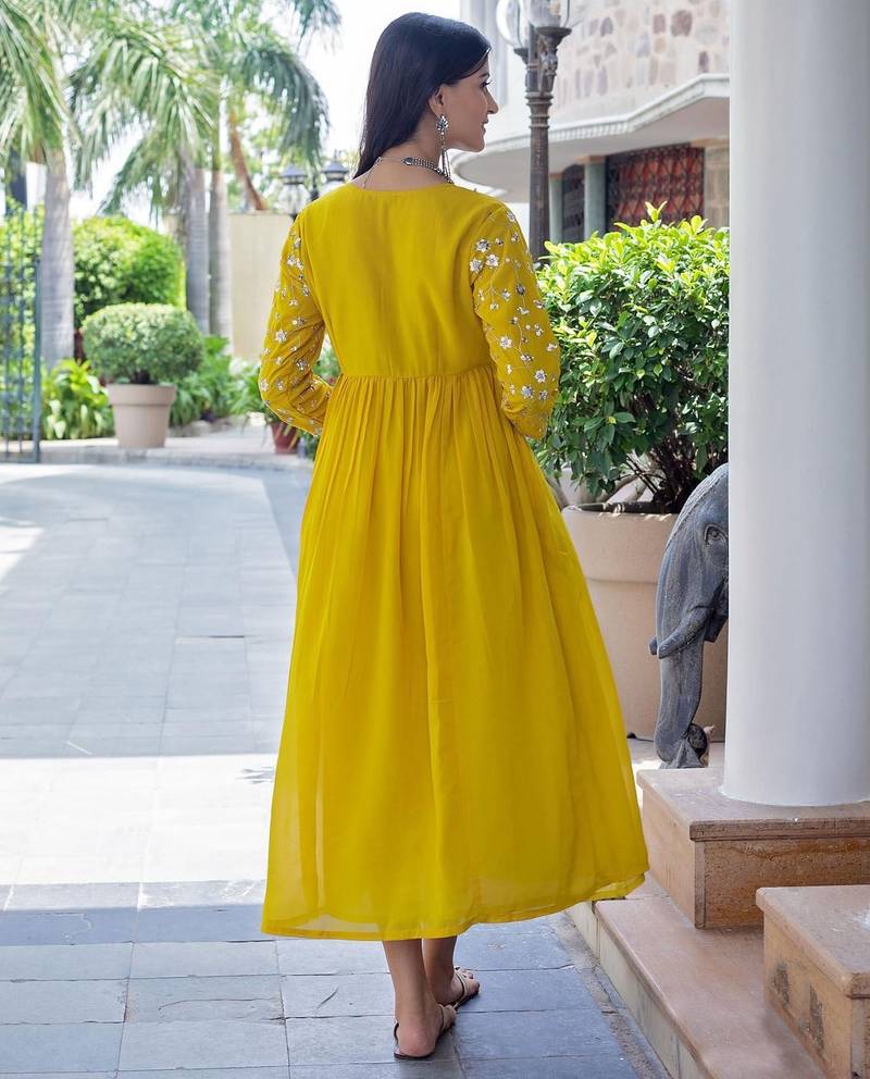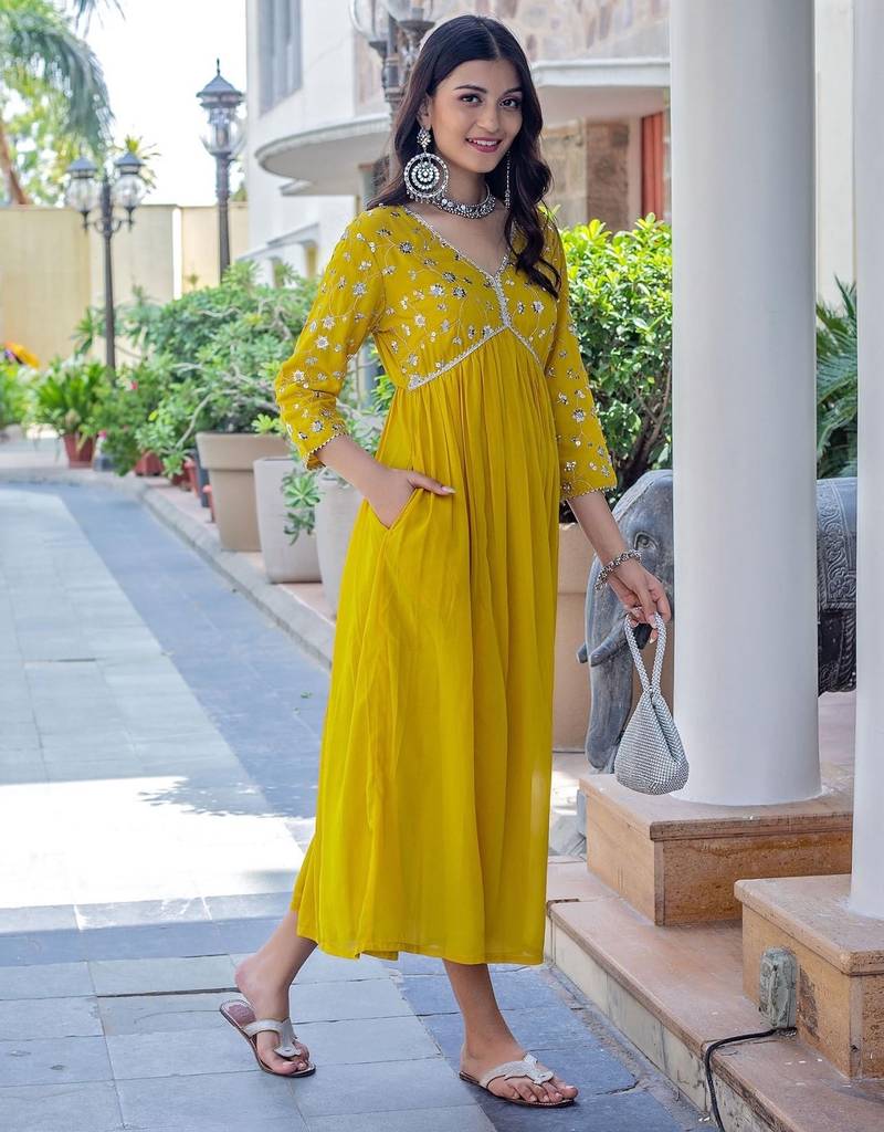 | Product Description | Light Up Any Room With The Radiant Aaysa Floral Embroidered Yellow Anarkali Kurti. Crafted From Luxurious Pure Rayon, This Kurti Offers A Soft, Silky Feel And A Beautiful, Flattering Drape That Moves Gracefully With You. The Vibrant Yellow Hue Is Perfectly Complemented By Delicate Floral Embroidery, While The Chic V Neckline Draws Attention To The Intricate Detail. The Traditional Anarkali Silhouette Ensures A Voluminous Flair, Making It An Ideal Choice For Pre Wedding Functions, Festive Gatherings, Or Simply Brightening Your Day. Available In Sizes M To Xxl, This Piece Offers Both Comfort And Standout Style. Fabric: Premium Pure Rayon (Soft Texture, Excellent Drape) Style: Flowing Anarkali Silhouette Color: Vibrant Yellow Detailing: Elegant V Neck And Subtle Floral Embroidery Ideal For: Festive Wear, Mehendi Functions, And Parties. |