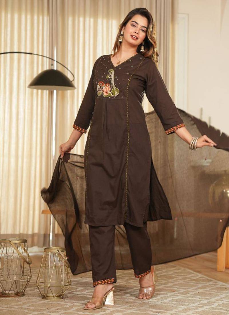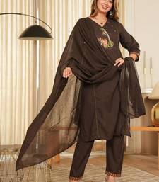 | Product Name | Floral Embroidered Brown V Neck Pure Cotton Kurta With Trouser & Dupatta Set | |