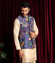 | Product Description | Off White & Purple Cotton Silk Kurta Chudidar With Raw Silk Embroidered Bundi Set. |