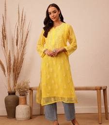 Hand embroidered yellow faux georgette lucknowi chikankari women kurta with slip