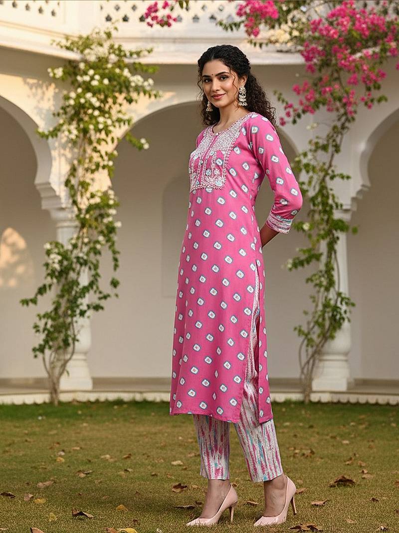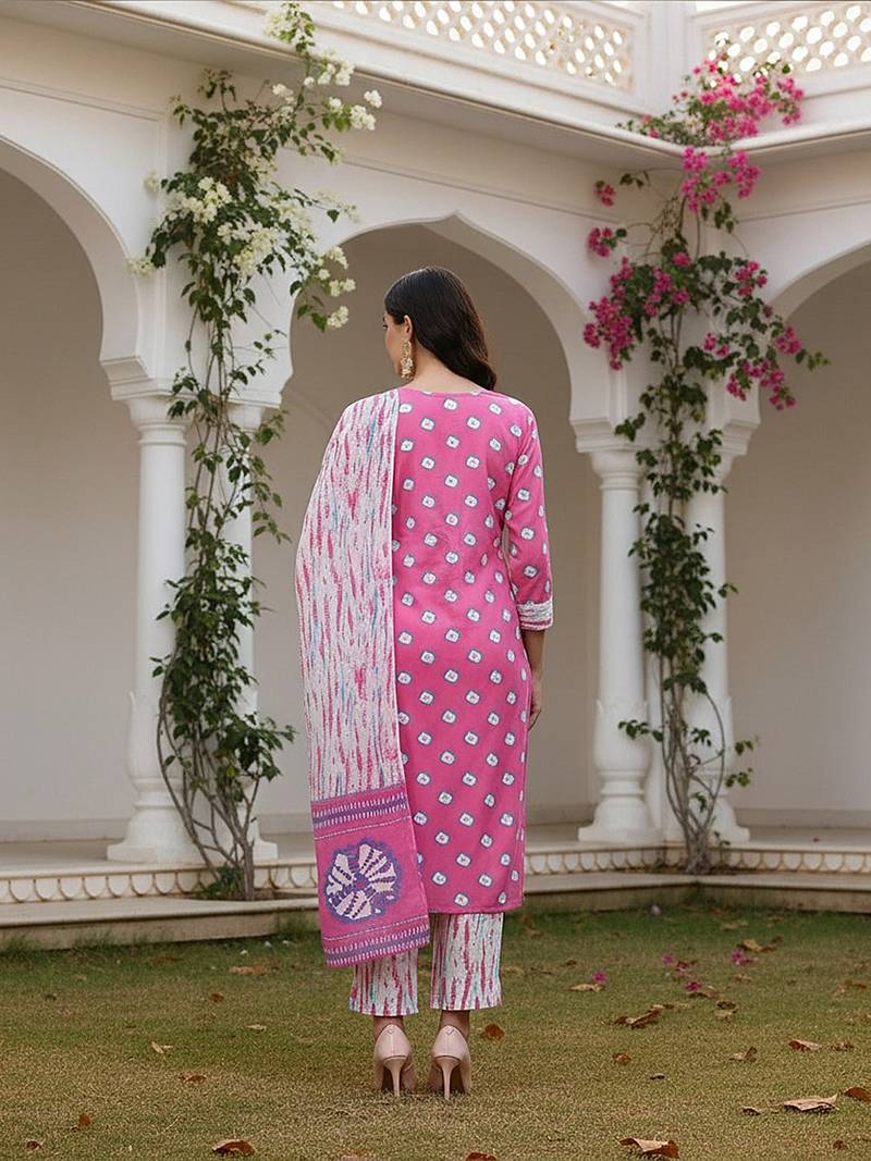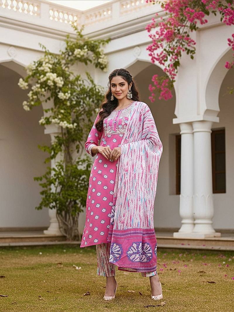 | Product Description | Secure This Outstanding Suit Set Crafted From Soft And Breathable Cotton Fabric. This Pink Colored Bandhani Printed Kurta Features A Round Embroidered Neckline Adorned With Frontal Buttons. It Has A Straight Hemline With Side Cutouts. It Is Paired With A Tie Dyed Straight Bottom Designed With A Pocjet And A Half Elasticated Waistband. The Outfit Comes With A Tie Dye Printed Dupatta Which Gives A Complete Look.