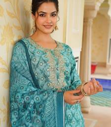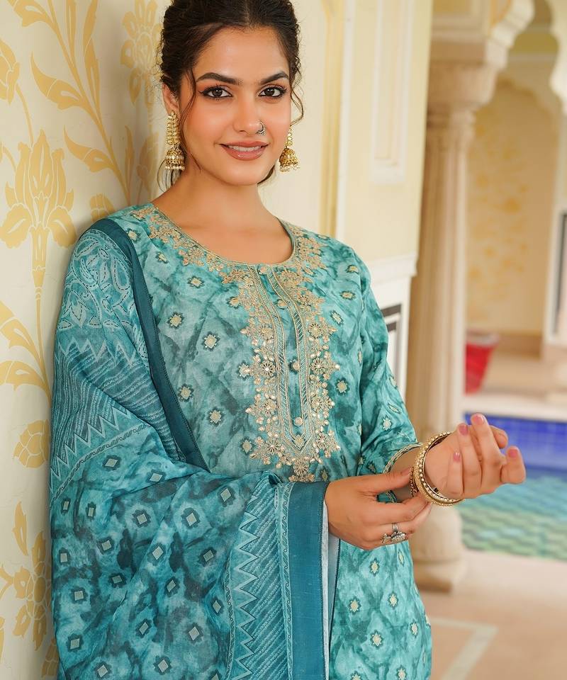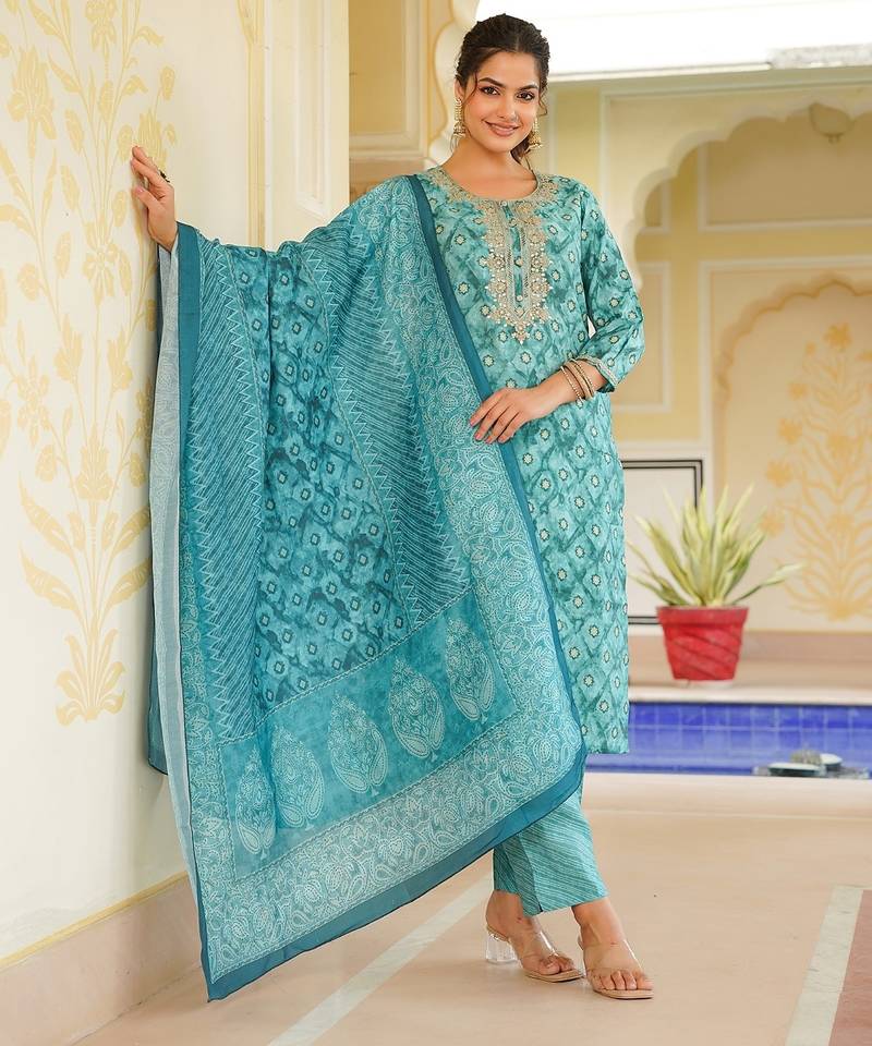 Sea green color embroidered silk blend styles kurta trouser with dupatta