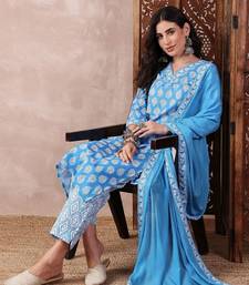 Women blue rayon blend floral printed straight kurta trouser with dupatta