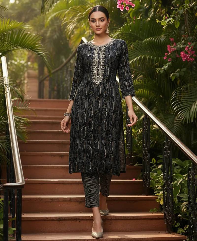 | Product Name | Women Blue Silk Blend Abstract Embroidered Straight Kurta | |