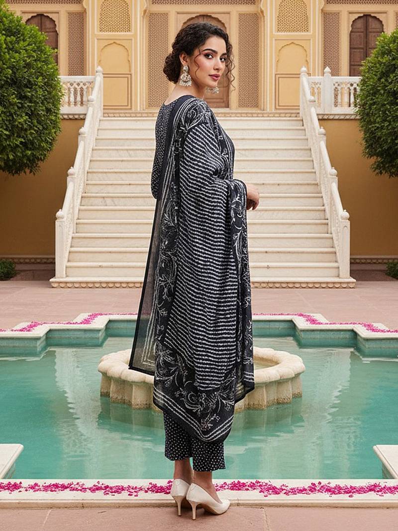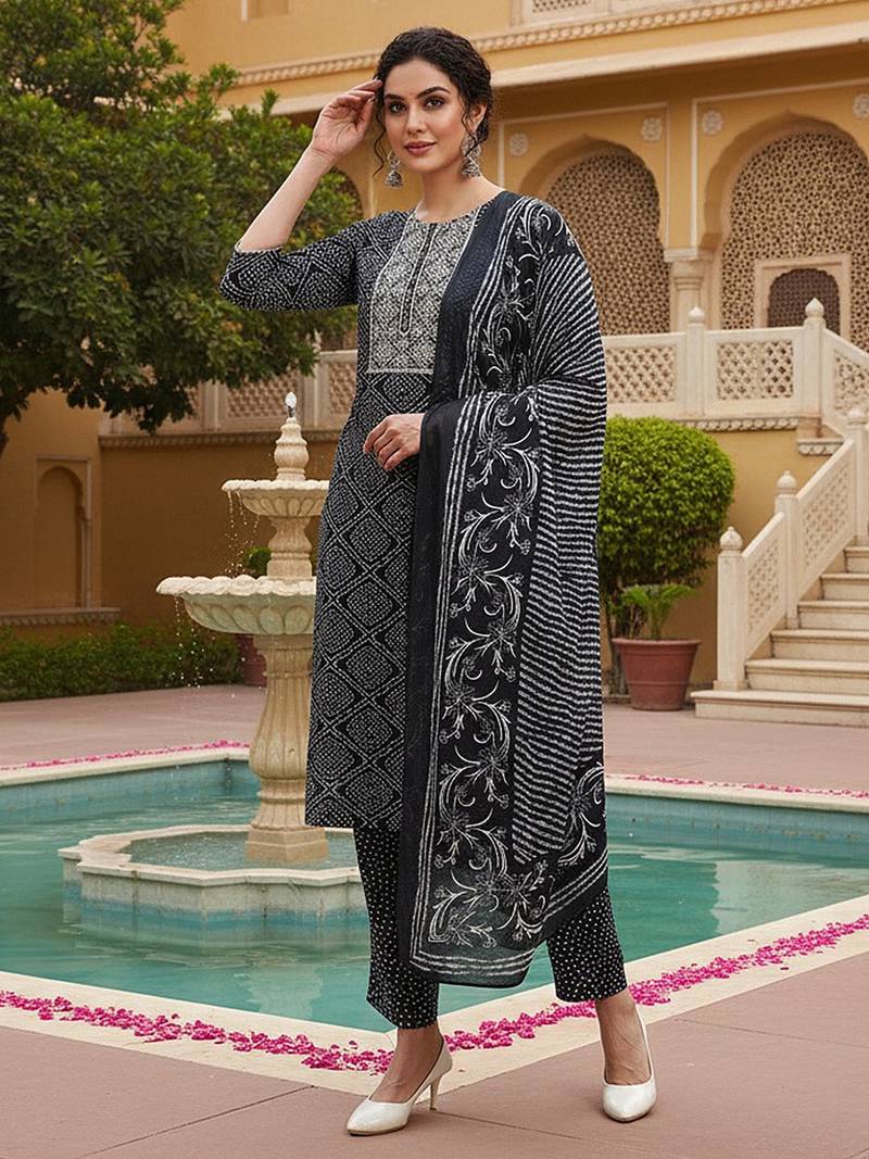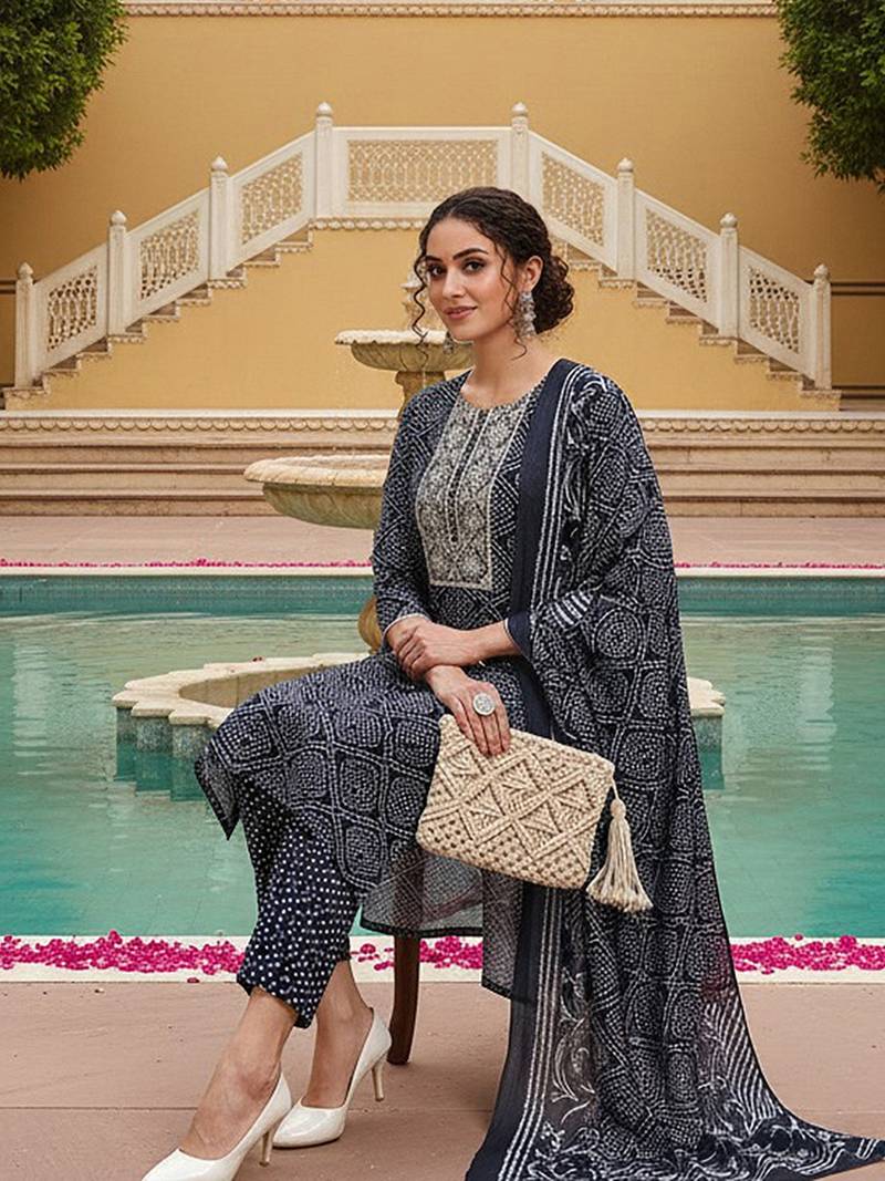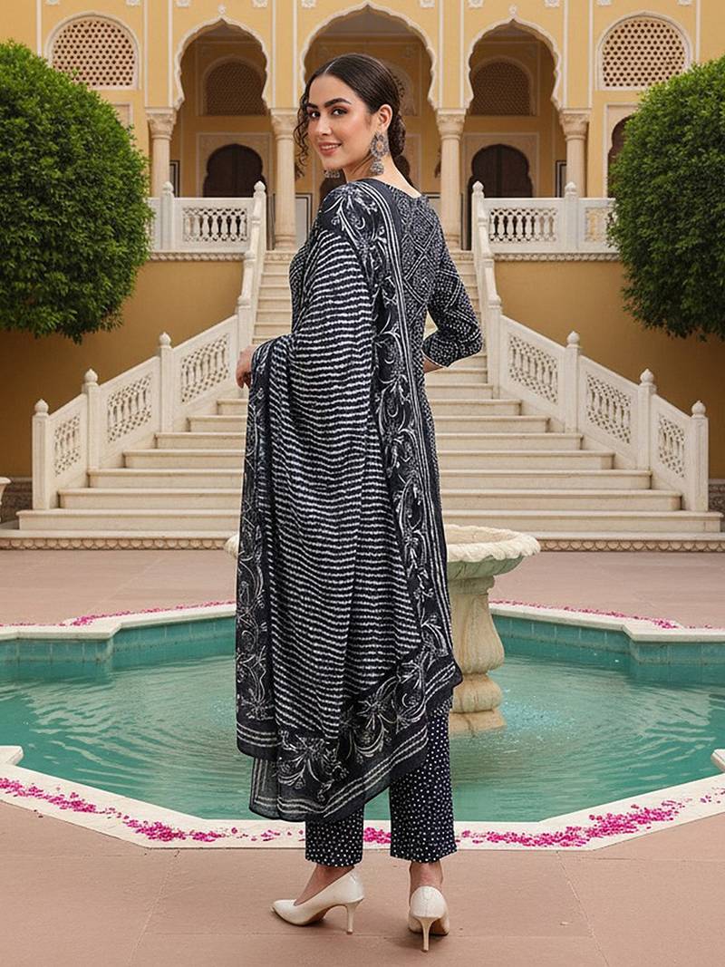 | Product Name | Women Navy Blue Rayon Bandhani Printed Straight Kurta Trousers With Dupatta | |