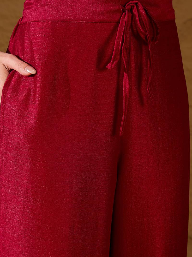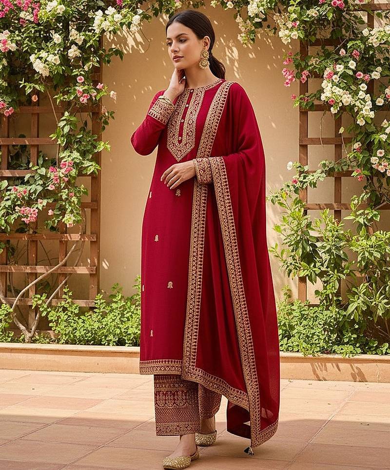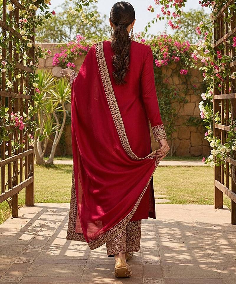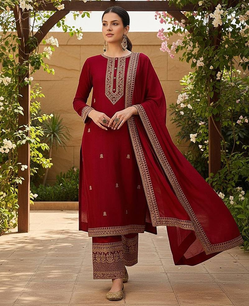 | Product Name | Women Red Silk Blend Solid Embroidered Straight Kurta Palazzo With Dupatta | |