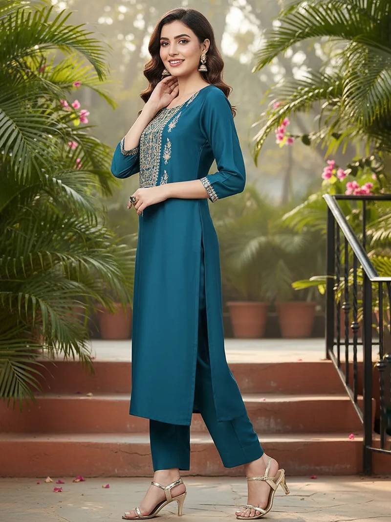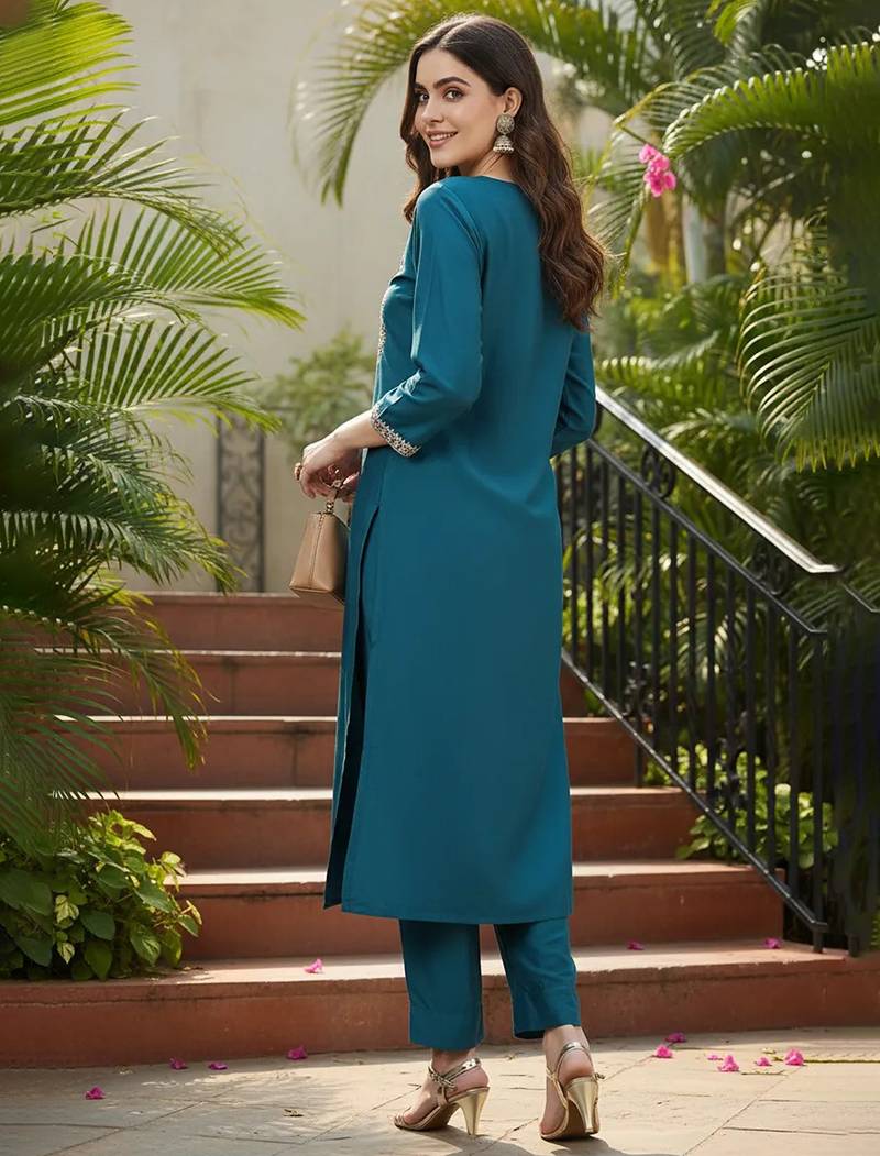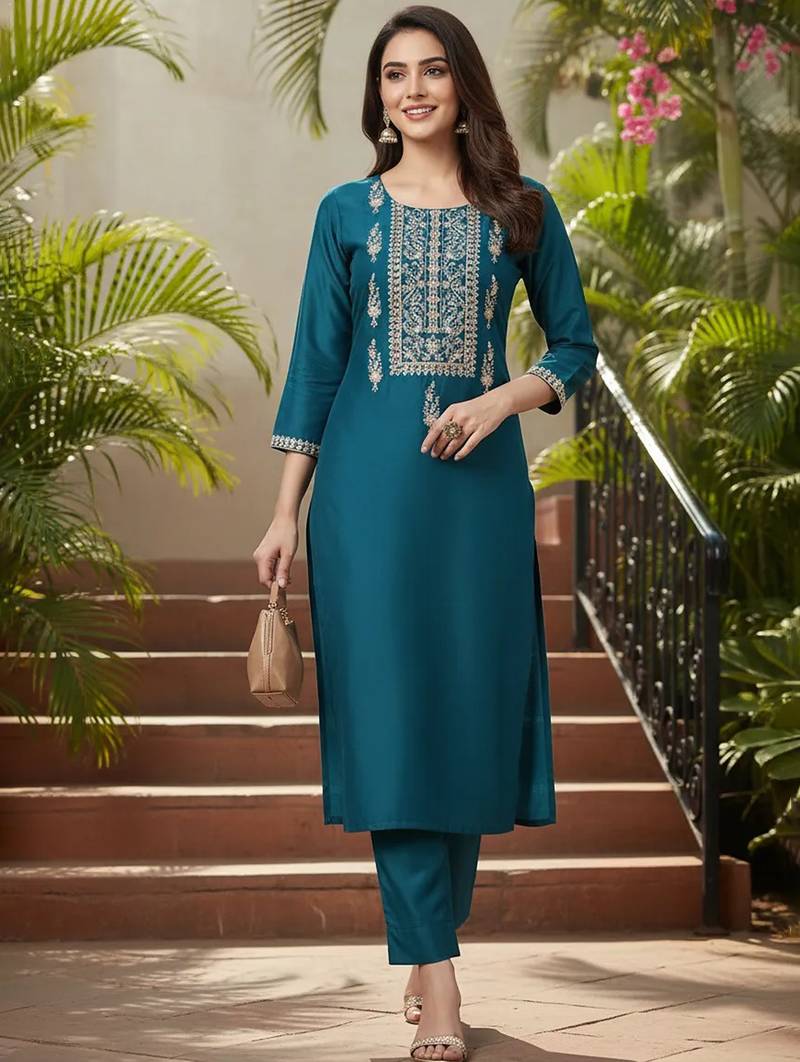 | Product Name | Women Teal Silk Blend Solid Embroidered Straight Kurta | |