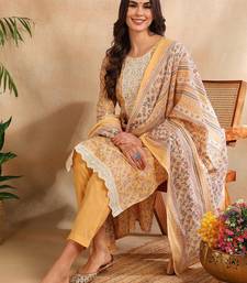 Yellow color embroidered cotton blend styles kurta trouser with dupatta