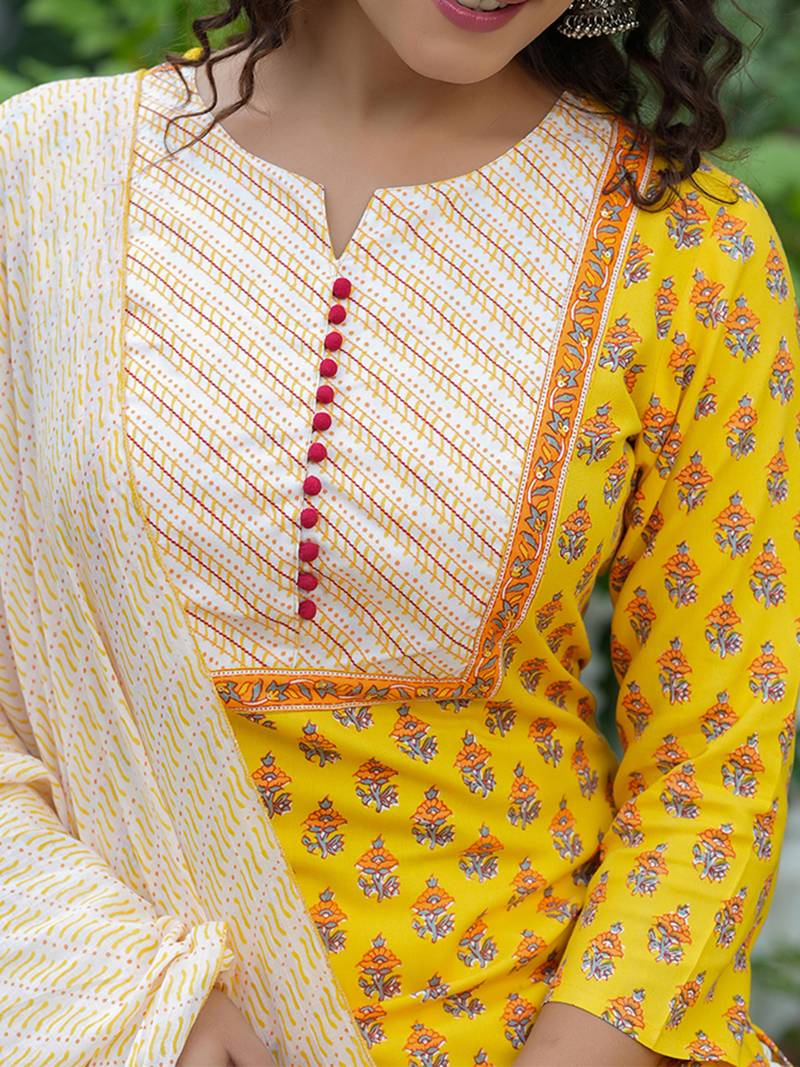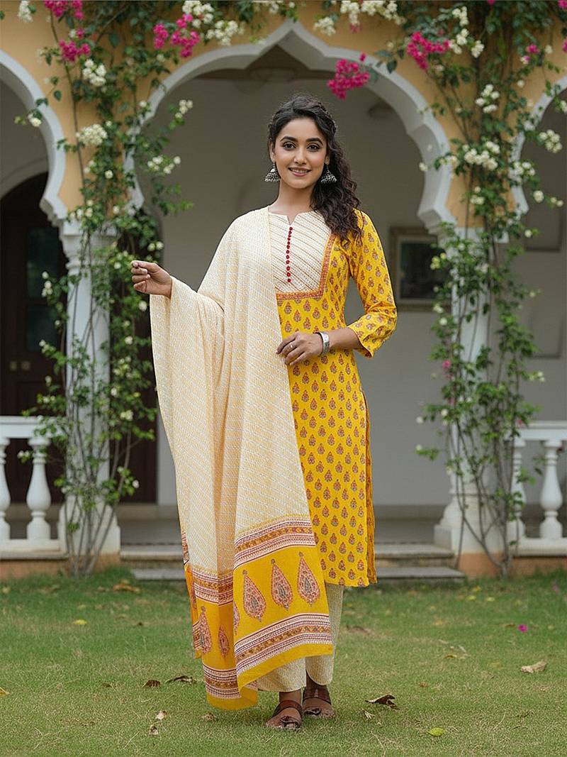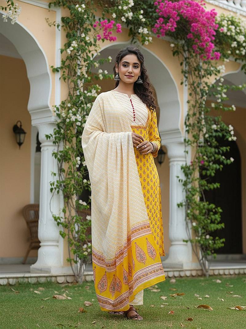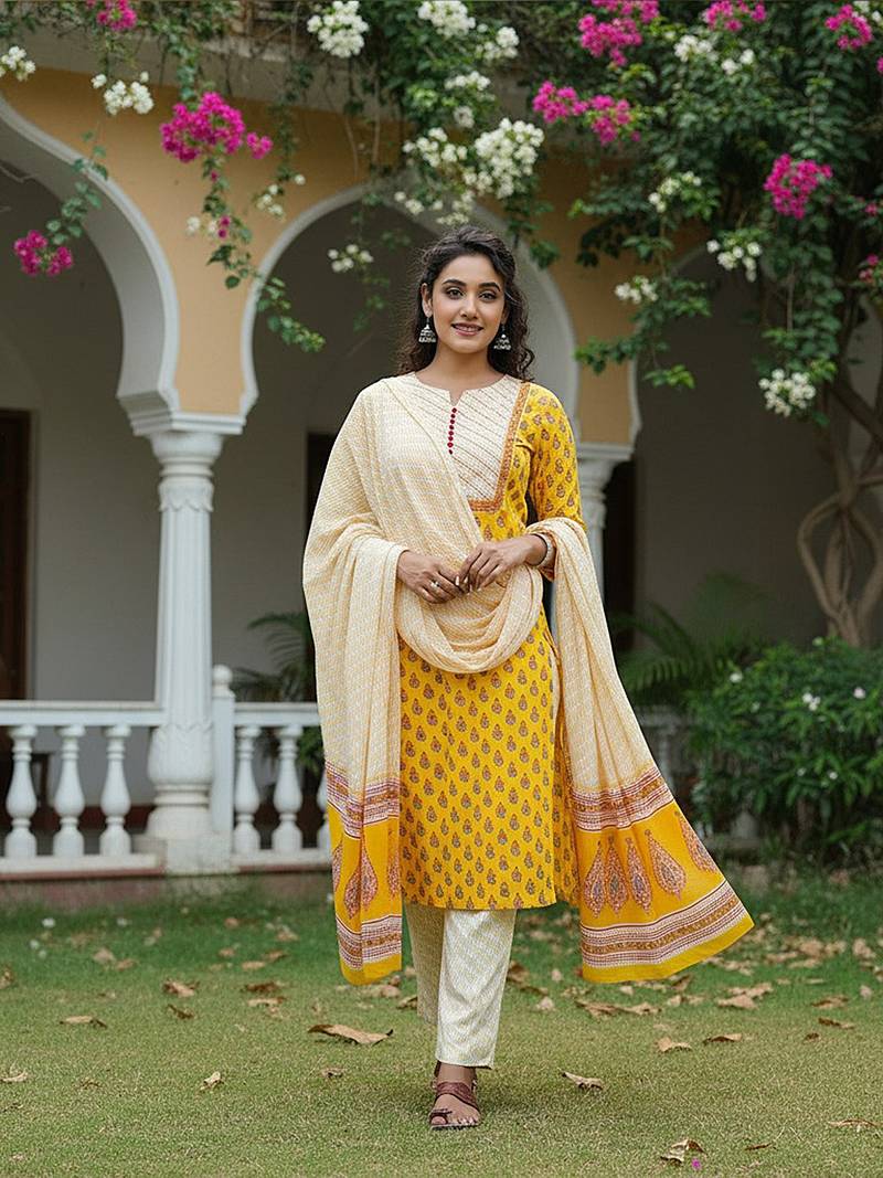 | Product Name | Yellow Color Printed Rayon Blend Styles Kurta Trouser With Dupatta | |