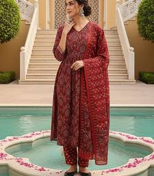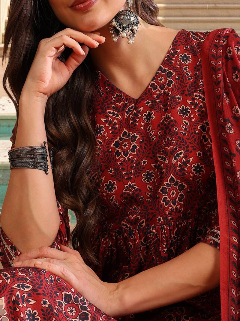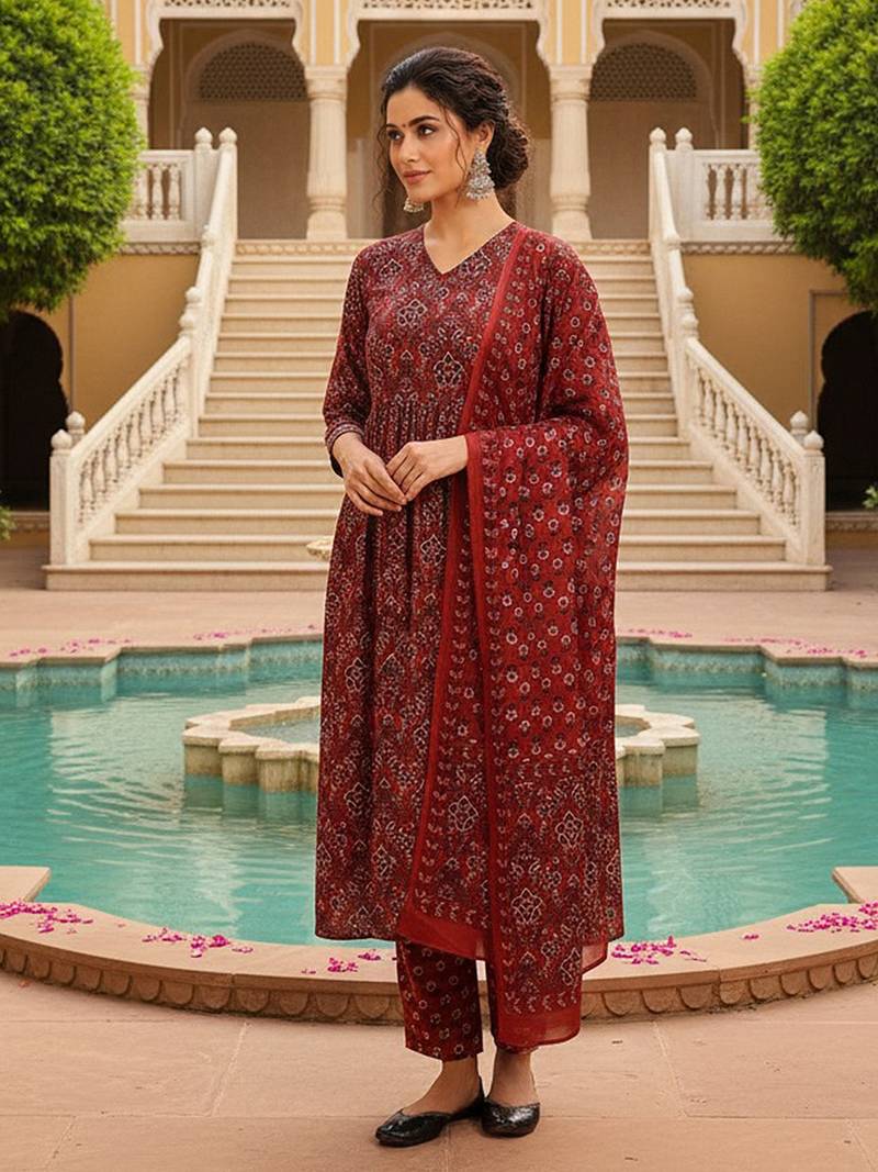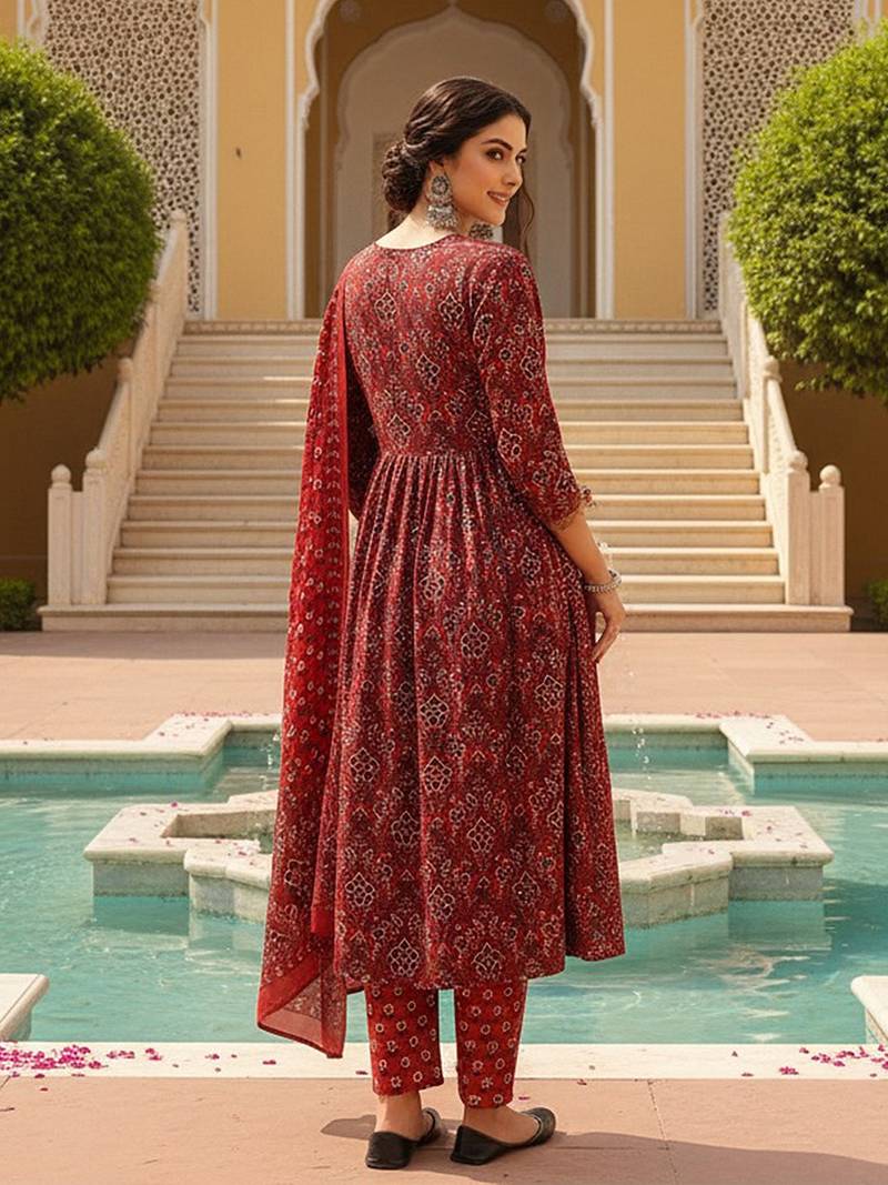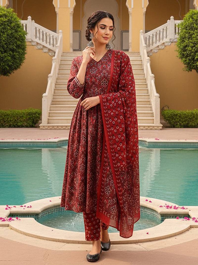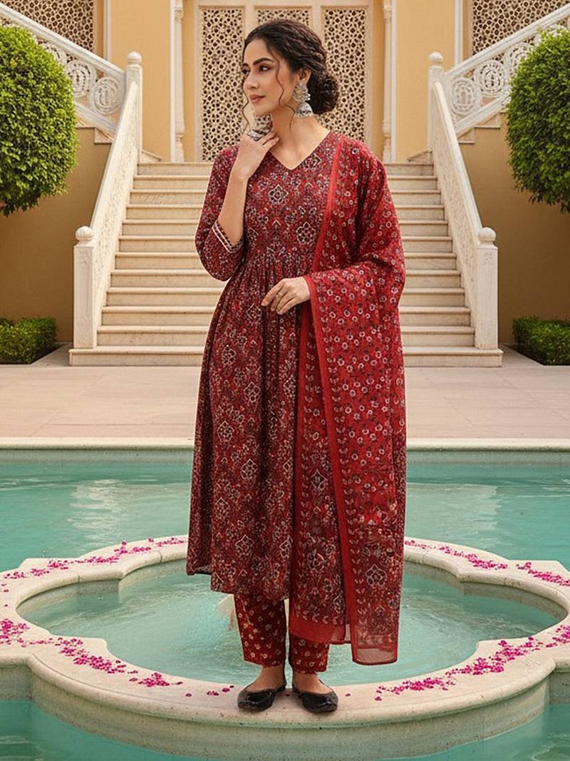 | Product Name | Women Red Color Cotton Blend Printed Fancy Flared Kurta Trousers With Dupata | |