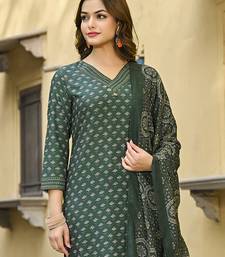 Women green cotton blend floral printed straight kurta trousers with dupatta
