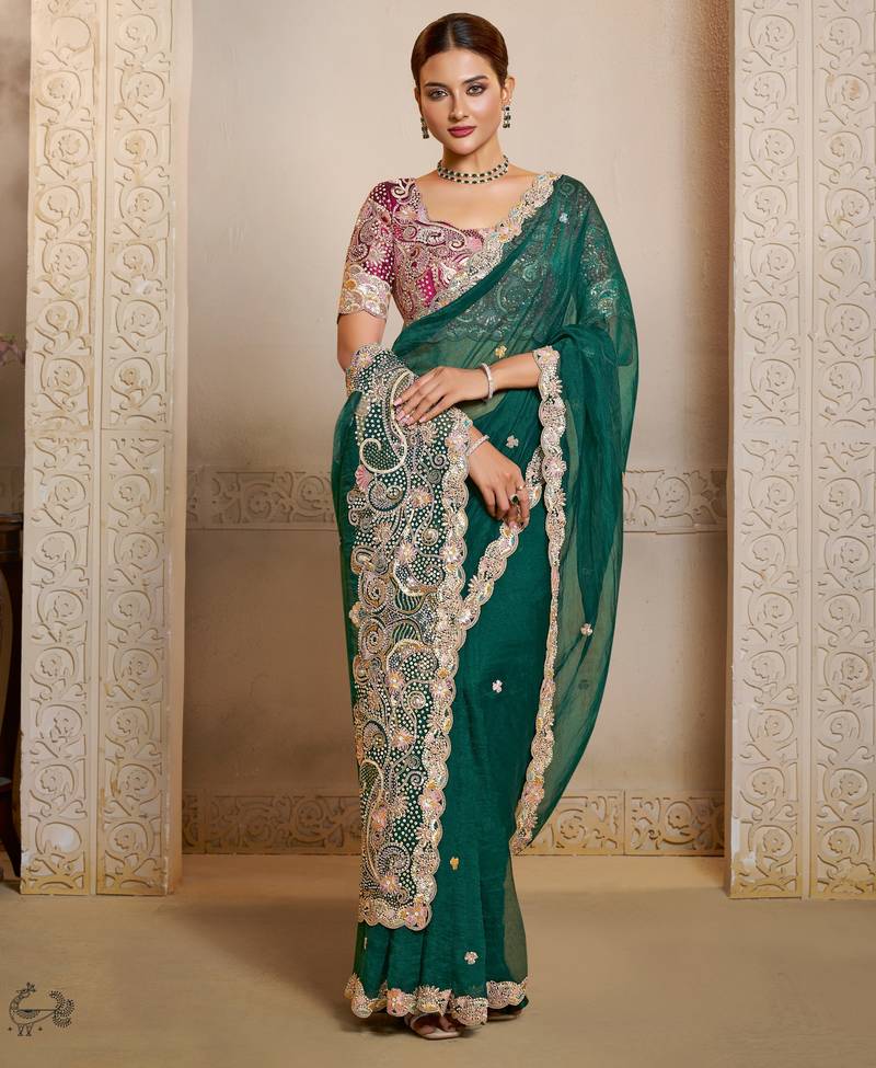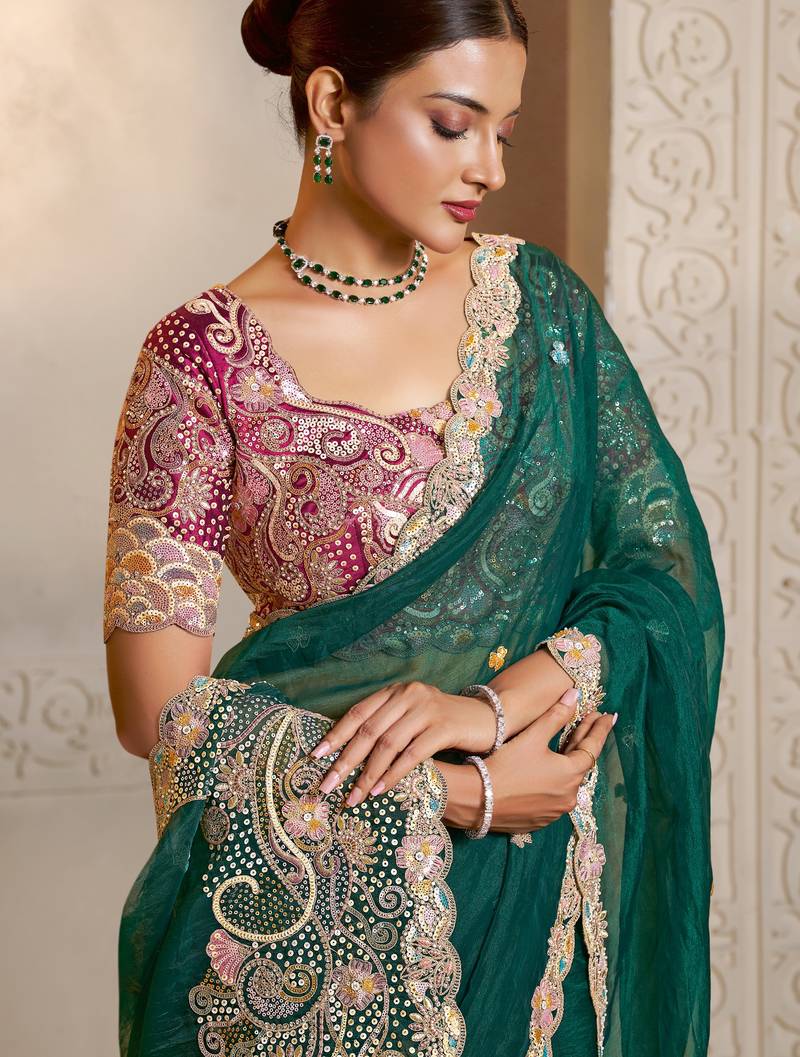 Green organza saree with multicolour thread and hand work saree+ heavy embroidered two ton satin blouse