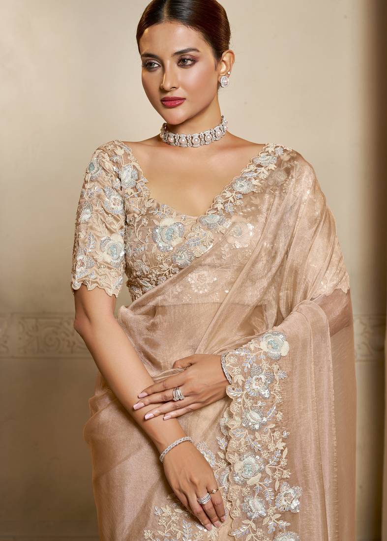 Organza crush satin saree with tissue work embroidery + blouse
