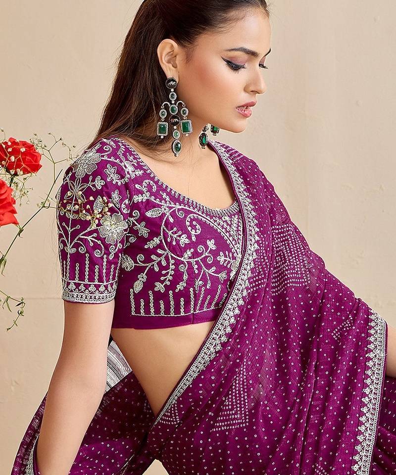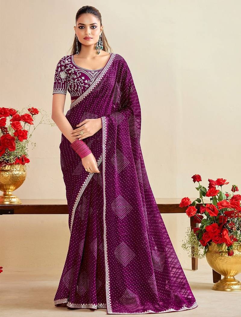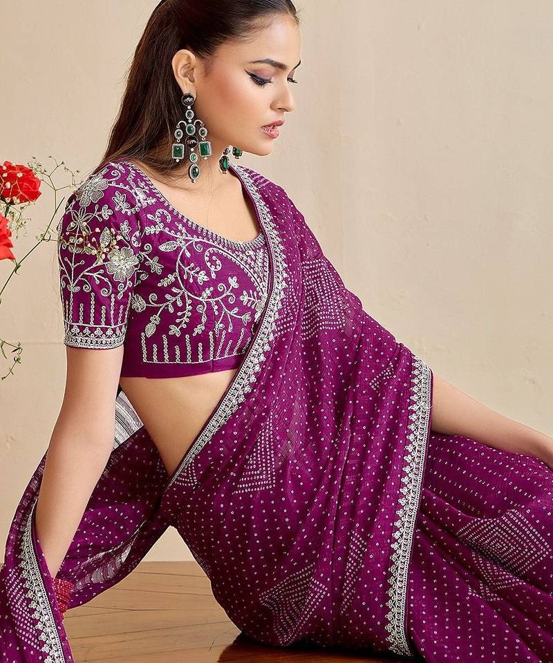 purple moss chiffon silk blend bandhani printed saree with embroidered lace boarder with blouse