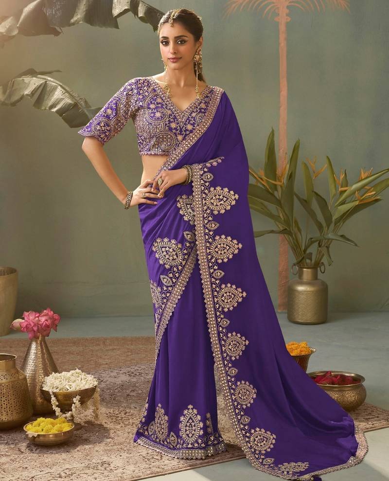 Purple premium bamber silk blend embroidered saree and gota patti work with blouse
