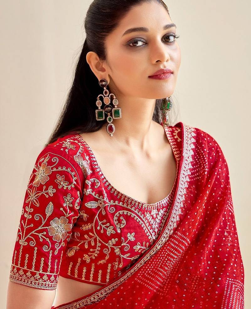 | Product Name | Red Moss Chiffon Silk Blend Bandhani Printed Saree With Embroidered Lace Boarder With Blouse | |