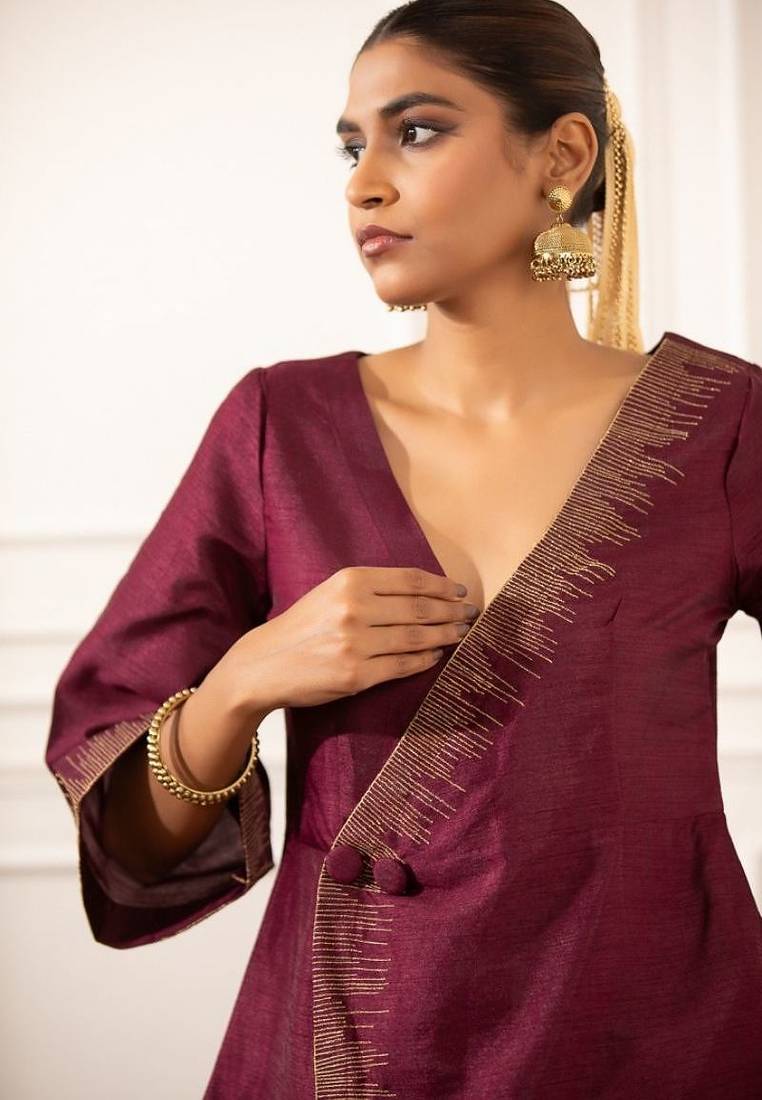 | Product Description | Grace Meets Tradition In This Beautifully Crafted Anikrriti A Line Angrakha Kurta Set. Made From Luxurious Raw Silk, This Kurta Features Delicate Zari Work That Adds A Regal Touch To Your Ethnic Wardrobe. The Classic Angrakha Silhouette Flatters All Body Types, While Practical Side Pockets Offer Modern Day Functionality. Full Length Sleeves And A Complementary Palazzo Make It Perfect For Festive Occasions, Formal Gatherings, Or Cultural Celebrations. |