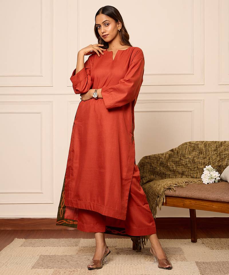 | Product Name | Rust Thread Embroidered Cotton Linen Blend Straight Fit Side Slit Kurta Plazzo Set | |