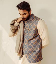 | Product Description | Silk Nehru Jacket With Highlight Emb Paired Up With A Khadi Kurta And Tonal Pants . |
