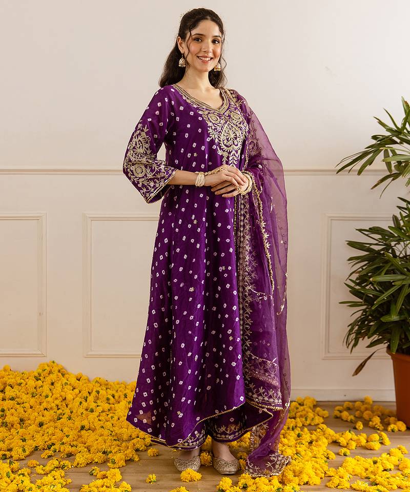 Handmade Royal Purple Bandhej Suit Set With Artisanal Tie Dye Buttis And A Central Hand Embroidered Zari Taari Medallion At The Neckline. The Sheer Organza Dupatta Is Traced In Continuous Taari Line Zari And A Broad Border, Framing The Jewel Tone For Refined Evening Elegance.