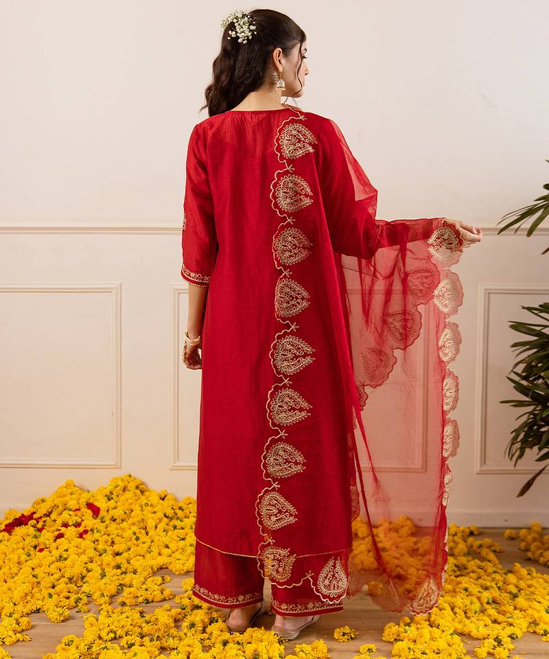 | Product Description | Red Straight Set: A Festive Red Straight Fit Kurta Set In A Glossy Chanderi Like Weave, Defined By A V Neckline Traced In Opulent Zari Foliage And A Scalloped Yoke Motif That Lends Heirloom Detail. The Kurta Is Dotted With Zari Buttas, While The Sheer Organza Dupatta Features Matching Scalloped Zari Appliqués And Highlighted Corners For A Dramatic Frame.