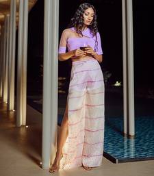 | Product Description | Ivory High Slit Tie Dye Trousers Highlighted With Delicately Scattered 3d Floral Sequin Teamed With A Sporty Lavender Crop Top. |