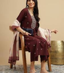 Brown rayon digital print kurta wih pant & dupatta stitched