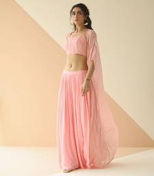 | Product Description | The Blush Pink Co Ord Set, The Short Spaghetti Style Blouse Handcrafted In Lined Pattern Paired With Palazzo Pants & A Striped Embroidered Cape In Sheer Organza. |