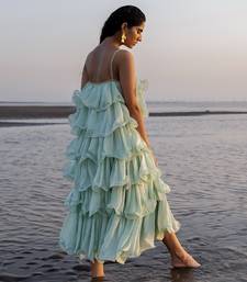 | Product Description | Mint Blue Full Ruffle Dress With Chitta Work And Embroidered Strap |