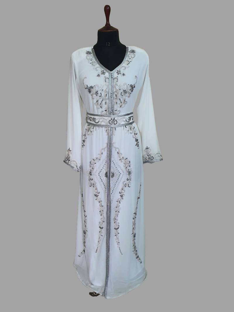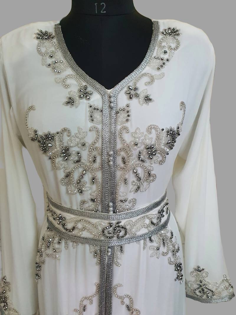 | Product Description | Luxury Off White Color Full Sleeves Moroccan Kaftan, This Luxurious Design That's Sure To Turn Heads, This Kaftan Dress Flows Over Curves And Boasts An Ornate Embellished Design With Silver & Beads, And Beautiful Crystal Stones. |