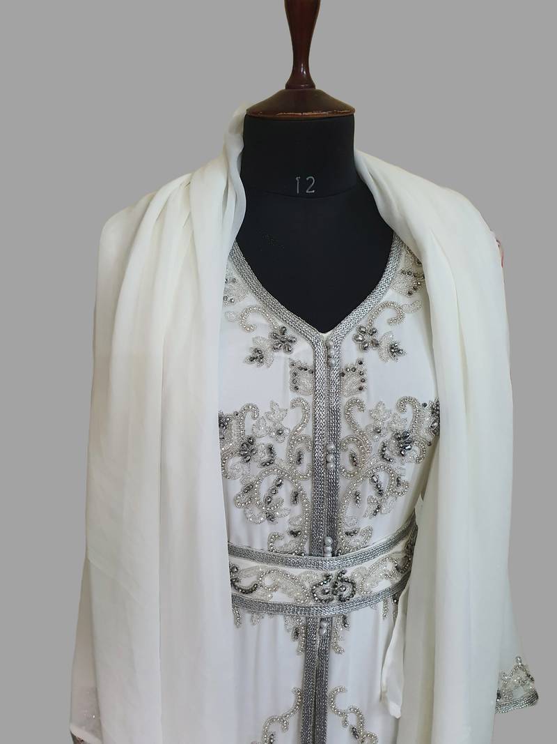 Off-white color luxurious handmade moroccan kaftan with hijjab