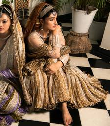 | Product Description | Silver Gold And Bronze Fish Cut Gota Skirt Off White Zardozi Cut Work Blouse White Net Flared Jacket And Crushed Dupatta. |