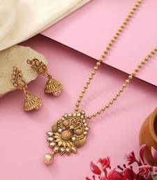 | Product Description | Necklace Length: 40.00 Cm X Width: 0.30 Cm | Pendant Length: 6.50 Cm X Width: 3.60 Cm | Earring Length: 5.30 Cm X Width: 1.80 Cm | Metal: Alloy With Good Quality Matte Gold Plated | Color: Gold | Stone: Glass Stone & Imitation Pearl | Gross Weight: 51.00 Grams | Package Content: 1 Piece Of Necklace/1 Pair Of Earrings | Back Finding: Post With Friction Back X Earring Style: Jhumki |