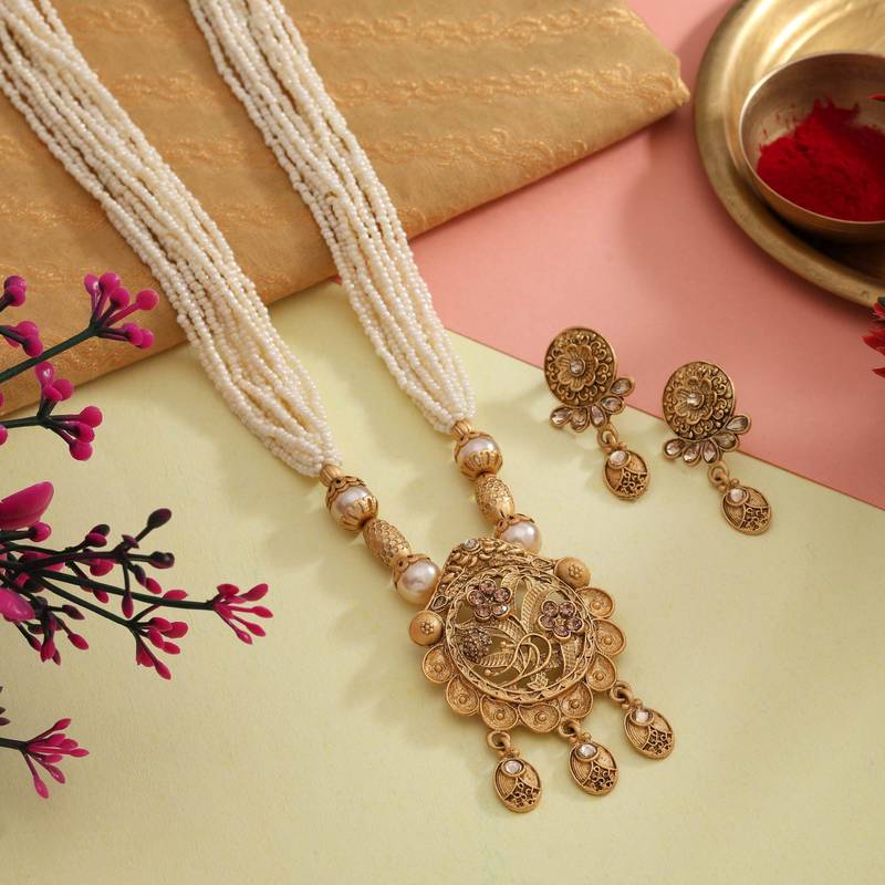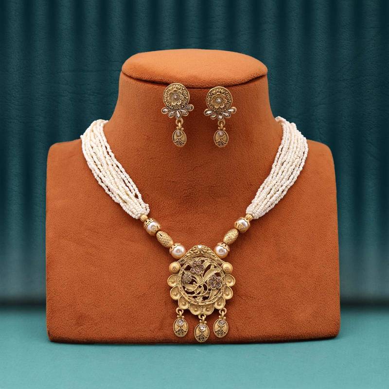 | Product Description | Necklace Length: 42.00 Cm X Width: 2.00 Cm | Pendant Length: 6.30 Cm X Width: 4.40 Cm | Earring Length: 4.00 Cm X Width: 2.20 Cm | Metal: Alloy With Good Quality Matte Gold Plated | Color: Gold | Stone: Glass Stone & Imitation Pearl | Gross Weight: 66.00 Grams | Package Content: 1 Piece Of Necklace/1 Pair Of Earrings | Back Finding: Post With Friction Back X Earring Style: Drop |