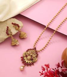 | Product Description | Necklace Length: 40.00 Cm X Width: 0.30 Cm | Pendant Length: 6.50 Cm X Width: 3.60 Cm | Earring Length: 5.30 Cm X Width: 1.80 Cm | Metal: Alloy With Good Quality Matte Gold Plated | Color: Rani | Stone: Glass Stone & Imitation Pearl | Gross Weight: 51.00 Grams | Package Content: 1 Piece Of Necklace/1 Pair Of Earrings | Back Finding: Post With Friction Back X Earring Style: Jhumki |