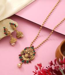 | Product Description | Necklace Length: 40.00 Cm X Width: 0.30 Cm | Pendant Length: 6.50 Cm X Width: 3.60 Cm | Earring Length: 5.30 Cm X Width: 1.80 Cm | Metal: Alloy With Good Quality Matte Gold Plated | Color: Rani & Green | Stone: Glass Stone & Imitation Pearl | Gross Weight: 51.00 Grams | Package Content: 1 Piece Of Necklace/1 Pair Of Earrings | Back Finding: Post With Friction Back X Earring Style: Jhumki |