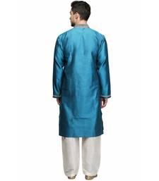 | Product Description | Blue Raw Silk Kurta Pajama With Silver Hand Crafted Silver Zari Work With Silver Stone Highlight. |