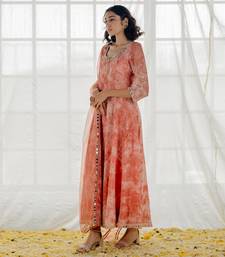| Product Description | Featuring A Peach Marble Tie Dyed Anarkali In Georgette Base With Mirror Work Neckline And Sequin Embroidery. It Is Paired With Matching Peach Churidar In Lycra And A Peach Silk Organza Dupatta With Mirror Work Border And A Matching Mask. |