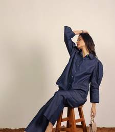 Dark blue solid denim cotton collared shirt with wideleg trouser co-ord set
