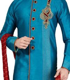 Turquoise embroidered art dupion silk sherwani