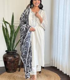 Off white viscose blend rayon heavy thread embroidery work with printed dupatta kurta pant set stitched