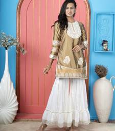 | Product Description | Antique Gold Silk Short Kurta With Gold Zari Botti Allover, Hand Embroidery Of Pearls And Crystals In Neckline And Hemline, Full Sleeves Of Silk Embroidered Lace And Brocade With Gold Gota Detailing On It, 2 Embroidered Motifs On Hemline With Brocade Detailing Below It. |