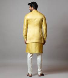 | Product Description | Mustard Yellow Nehru Jacket In Linen Satin, Mid Thigh Length Embroidered With Contrasting Colored Resham Threads With Silver Katdana Highlights In A Fishbone Pattern. Paired With Same Colored Bam Silk Kurta Embroidered With Katha Stiches. Color Of The Actual Garment May Vary Due To Lighting Conditions During The Shoot. |