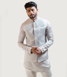 | Product Description | Grey Nehru With Maple Leaf Motif Using Threadwork And Kathdana Work Embroidery With Grey Short Kurta Having Pintucks Detailing On The Sleeves Paired With A Cream Narrow Fitted Pant Pajama. |