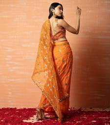 | Product Description | Featuring An Orange Prestitched Saree In Soft Net And Modal Silk Base With Intricate Hand Embroidery. |