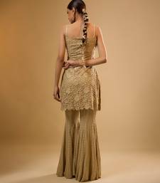 | Product Description | This Look Features A Champagne Gold Kurta Sharara Set. The Floral Cutwork Net Kurta Is Embroidered With Thread And Sequin. It Is Teamed With A Georgette Sharara Embroidered In Sequin And Threadwork Lines. A Matching Net Dupatta With Embroidered Scallop Sequin Border And Butti Scatter Completes The Look.