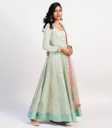 | Product Description | Featuring A Mint Green U Neckline Anarkali Pleated At The Empire Line And Enhanced By The Detailings Of Golden Threadwork And Sequins Work On Sleeves Paired Up With A Little Floral Embellished Dupatta.